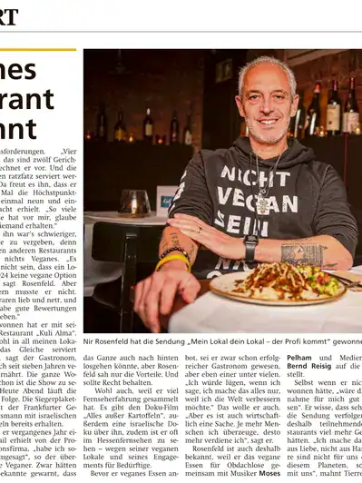 The video in the ARD media library: Everything but potatoes in episode 1, Nir Rosenfeld's Dream of Peace, an ARD documentary featuring Nir Rosenfeld and his story. A world without animal suffering – the goal of vegan Frankfurt resident Nir Rosenfeld. In his Frankfurt restaurants Kuli Alma, 269 and Dominion, this is already a reality.