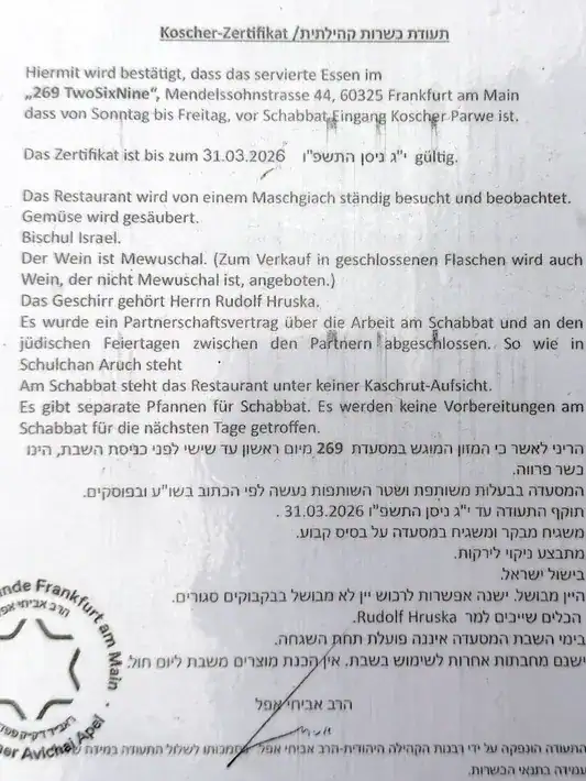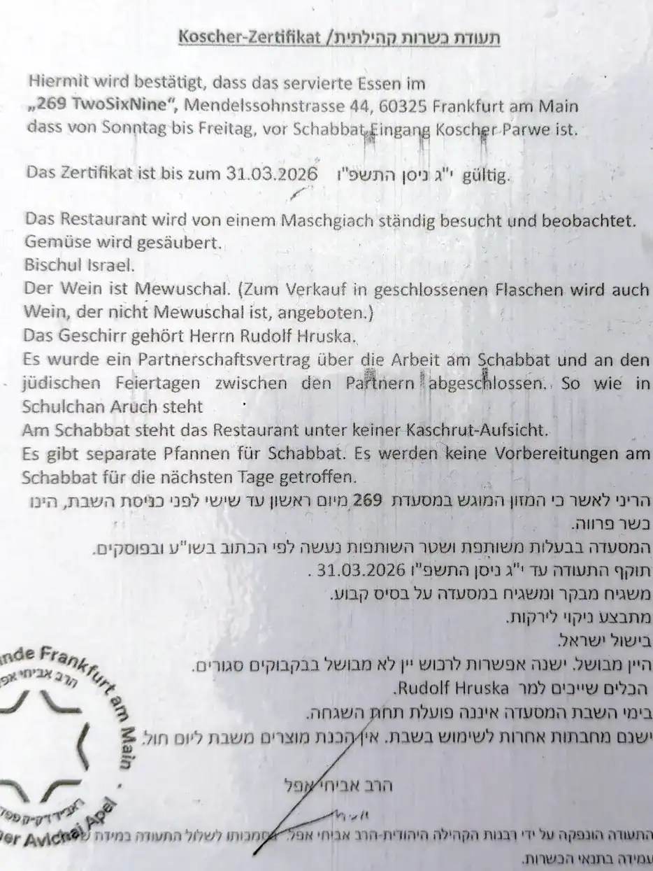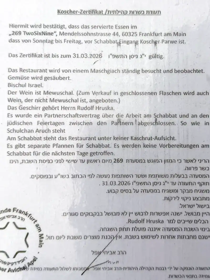 Here you can find our kosher certificate for the 269 Frankfurt restaurant.